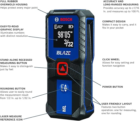 • ACCURATE: Features long range measuring with extreme accuracy and measures distances up to 100 feet to within 1/16 inch. Measures in meters, feet inches, with fractions or decimals.