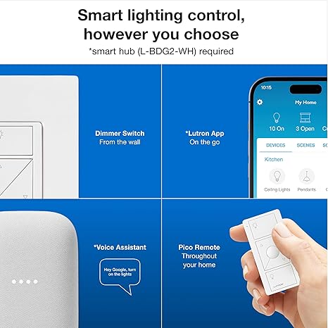 - CONTROL WITH THE LUTRON APP: Manage your lights anywhere with the Lutron app; control lighting and advanced smart features such as scenes, scheduling, geofencing, smart-away, timers, app control, and more